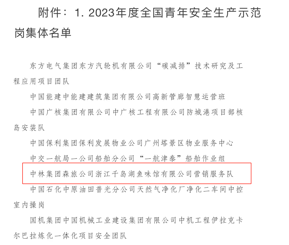近日,共青团中央、应急管理部联合公布了《2023年度全国青年安全生产示范岗集体名单》,中林集团千岛湖鱼味馆营销服务队榜上有名!