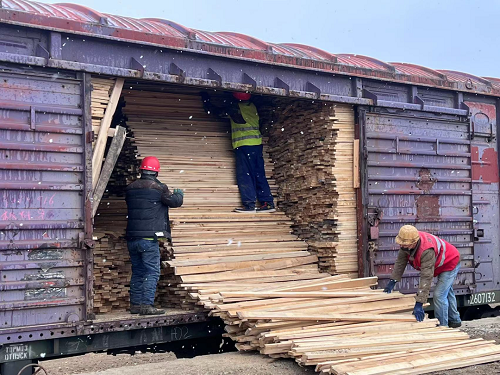 满洲里伊利托天气突变坚持作业4月19日,内蒙古满洲里下了一场春雪,林场集团所属满洲里伊利托基地现场部工人冒着风雪,在宽轨1道,执行俄罗斯棚车散装木材卸车任务。工人清晨5点开工,经过一天紧张有序的作业,晚上19点圆满完成57节车厢的卸车任务。(摄影:张震)大连中林质量管理测量先行林场集团所属大连中林投资有限公司业务部职员正在检尺圆木,以确定规格,进行准确分类。(摄影:欧阳莹)成都中林凝心聚力铸就品质