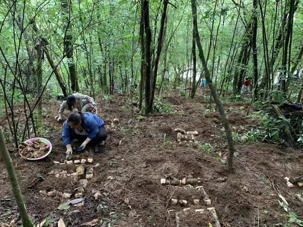 天麻基地采挖现场丰收时节,重庆市城口县周溪乡龙丰村的村民们正在忙着给林地里播种蜜环菌,为仿野生天麻生长发育提供好环境。天麻基地采挖现场城口县地处大巴山腹心地带,良好的自然条件,被世界自然基金会列为中国17个生物多样性保护关键地区和11个优先重点保护区域之一。全县有药用价值中草药3800余种,可供开发利用1000余种,多个品种入选重庆市道地优势中药材,被誉为“大巴山生态药谷”