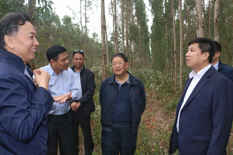 调研期间,外部董事一行参观了企业展厅,听取了公司主要负责同志的工作汇报,并先后到林业科学研究分公司、工业公司、北坡林场、廉江林场,实地考察了解桉树培育与种植、木片加工、发财树种植、康养小镇建设等情况。