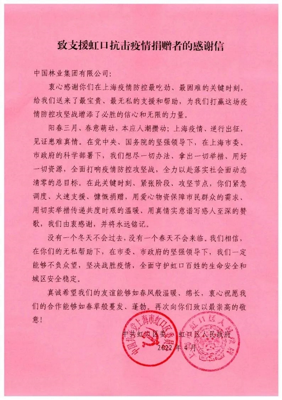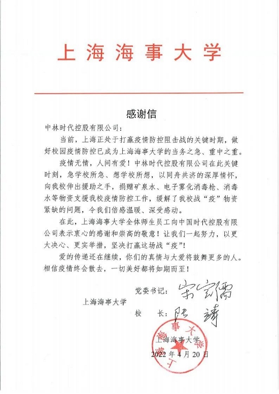 次日,上海虹口区政府与上海海事大学均发来感谢信,感谢中林集团及中林时代在关键时刻挺身而出,向为抗击疫情作出努力和帮助的国资央企表达诚挚敬意。