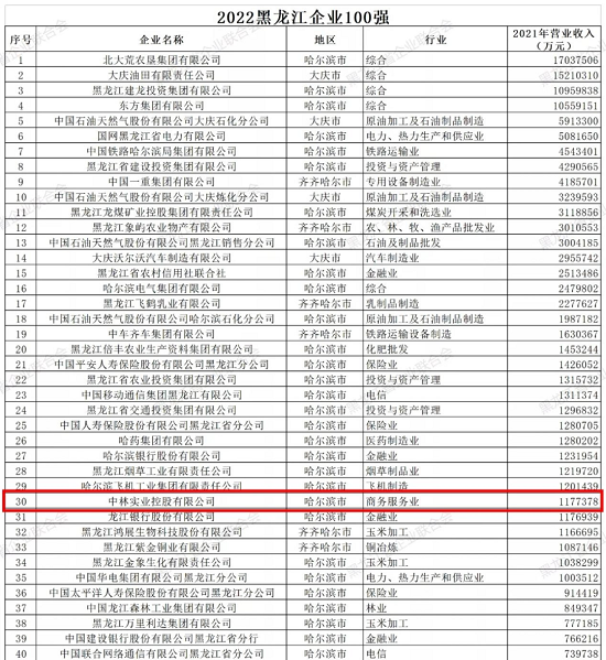 日前,黑龙江省企业联合会在中国企业联合会的指导下公示了《2022黑龙江企业100强名单》,中林集团所属中林实业控股有限公司凭借强劲的综合实力和市场竞争力,位列综合排名第30位。