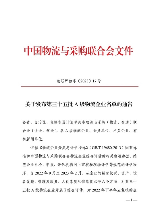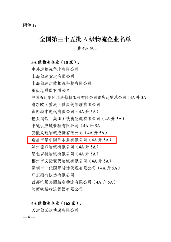 2月20日,从中国物流与采购联合会发布的全国第三十五批A级物流企业名单获悉,中林集团所属瑞昌市华中国际木业有限公司获评国家5A级物流企业。