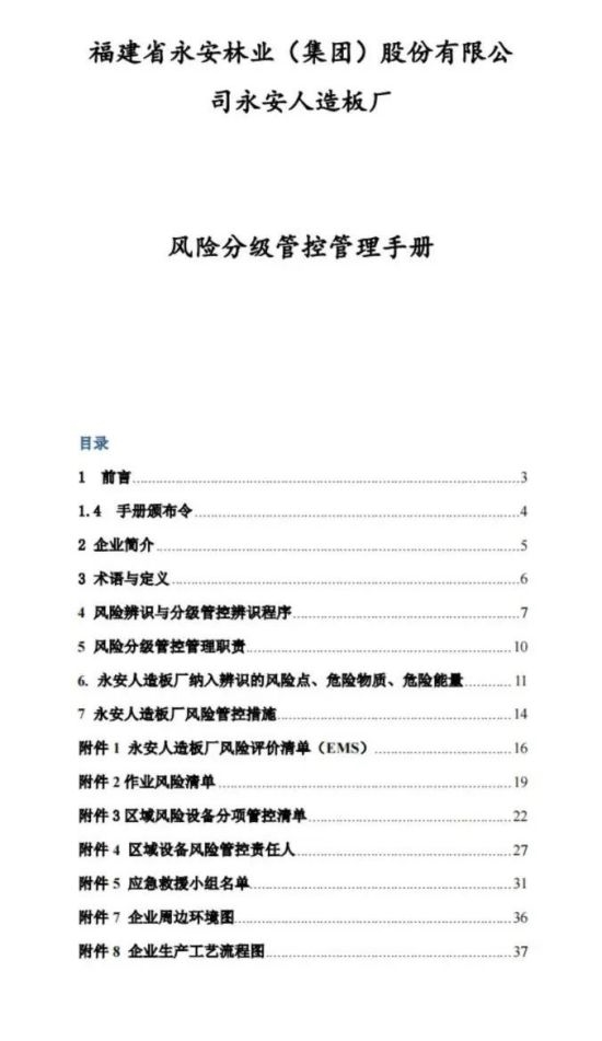 中林控股所属永安林业人造板厂积极完善年度《风险分级管控管理手册》,并以此作为干部职工安全、规范开展生产管理工作的行动依据。管理人员可依据手册内容,明确不同区域、作业内容的风险等级以及个人所属的管控管理职责,来制定针对性管理措施。目前,该手册已成为永安林业人造板厂建立健全风险分级管控与隐患排查治理双预防机制的重要组成部分,为其实现安全高效生产提供了有效助力。