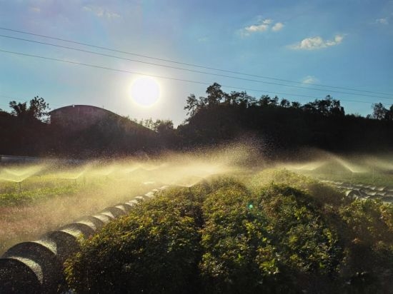 永安林业种苗中心的苗圃前,夕阳的余温穿过水滴融进树苗的躯体,人工与天然的滋养交相辉映,呈现一幅人与自然和谐共生的美好画面。
