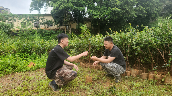 推动油茶项目高质量发展,既要有纵览全局的长远目光,也要有攻坚克难的奋斗精神。为实现示范基地高效、高产两手抓、两手硬,梧州事业部经过反复论证和品种比较,最终因地制宜地采用了“油茶‘岑软2号’、‘岑软3号’+黑木相思”套种模式,通过良种、良法配套以短养长,深挖用地潜力,通过经济树种与用材林混交的多元化经营,实现云会村经济效益和生态效益协同发展。