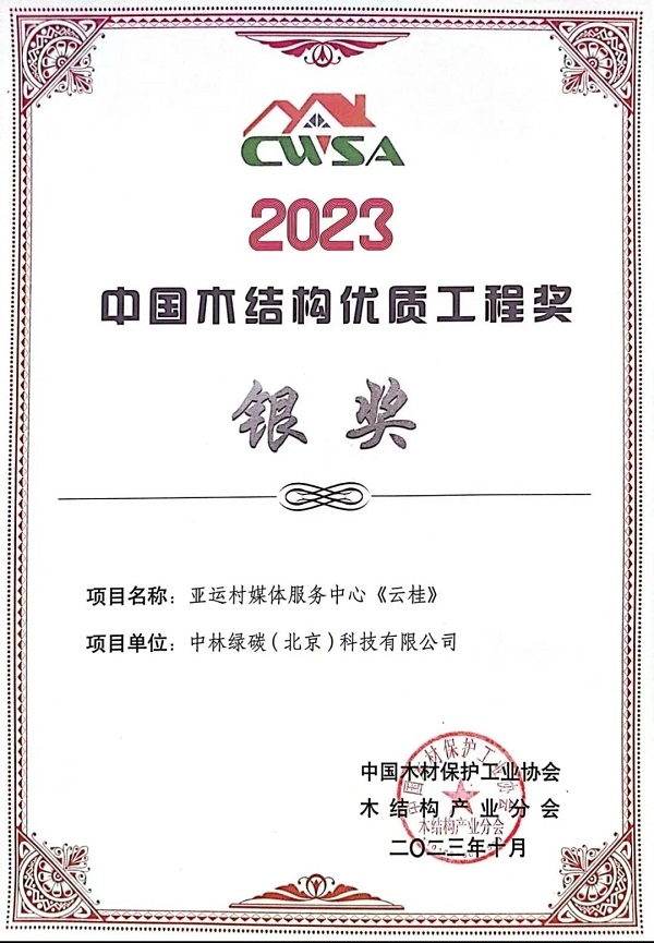 近日,中林集团所属中林绿碳公司携杭州亚运会亚运村服务中心《云桂》项目受邀出席“第十届中国木结构产业大会暨第四届中国-欧洲木竹结构产业合作论坛”。会议期间,中林杭州亚运村《云桂》项目得到业内人士的一致认可,并荣获2023中国木结构优质工程奖银奖和2023年中国装配式木竹结构建筑行业“推荐品牌”。