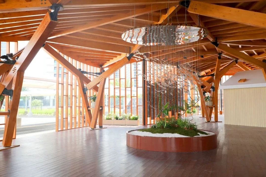项目的设计灵感来源于杭州市花桂花,也是杭州第19届亚运会中唯一以桂花立意创造的低碳绿色建筑,其建筑结构源自中国传统木结构斗拱的互承结构,并结合了现代木结构链接工艺。《云桂》项目采用云杉胶合木作为建筑主体,总体使用量约为65立方米,建筑全过程固定二氧化碳约60吨。此外,新型低碳材料“重组木”作为地板也应用于本次项目中,对于小径级国储材的有效利用有积极推广作用。同时,设计师遵循建筑再利用原则,采用了模块化设计,保证建筑可以多次重复拆装使用,在亚运会及残奥会结束后可以应用于更多建筑场景中(如:候车亭、售货商店、城市小型展厅等),体现了项目的可持续性,更符合“双碳”战略背景下建筑业绿色低碳环保的新发展理念。