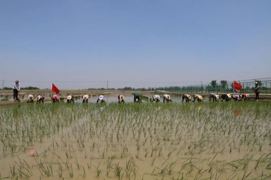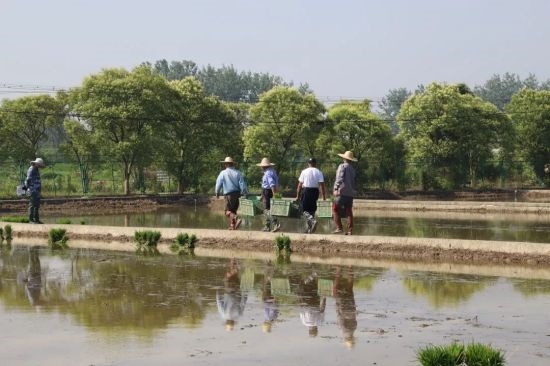 在平坦的稻田里,工人们辛苦劳作,转眼间,一块块空荡荡的黑土地披上了崭新的绿装。放眼望去,一棵棵秧苗挺立在水中,翠绿喜人,在风的拨弄下,像一串串跃动的音符,在稻田里交奏出最美的田园乐章,一幅辛勤劳作的初夏农耕图在田地里徐徐展开。