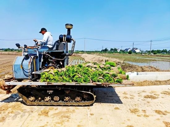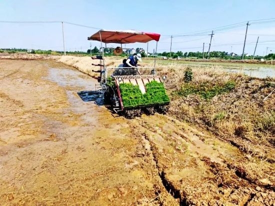 农机手熟练地操作着插秧机,另外一至两人站在插秧机上摆放秧苗,一株株嫩绿的秧苗从插秧机苗盘上滑落,稳稳地立在水田里。不一会儿工夫,一大片水田便披上了“绿装”,一排排秧苗栽插整齐且间距相当。微风吹过,秧苗轻轻摇摆,荡漾起无限生机。