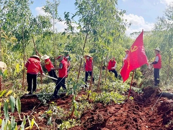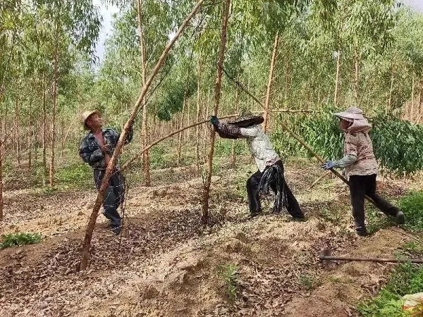 △ 遂溪林场梁家林队一线工人扶正倒伏的幼林