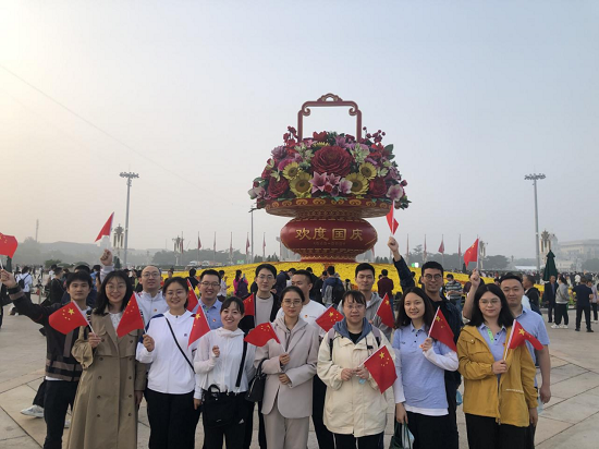 2021年9月29日清晨六时许,国旗仪仗队迈着整齐的步伐护卫着鲜艳的五星红旗走向升旗台。当雄壮的国歌响彻天安门广场,当升旗手把国旗抛向空中,全体共青团员行注目礼,高唱国歌。凝视着高高飘扬在天安门广场上空的国旗,团员们眼含热泪,对于伟大祖国的敬爱之情和强烈的民族自豪感油然而生。升旗仪式结束后,团员们难掩内心的激动与喜悦,纷纷与国旗合影,表达对祖国母亲的无限热爱,共祝祖国繁荣富强。