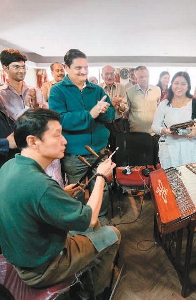 在印度中部城市那格浦尔,中国胡琴演奏家季节(前左)与当地民众互动交流。新华社记者 郑焕松摄